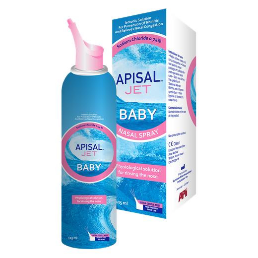 Short Description: • Isotonic solution for prevention of rhinitis • Contains sodium chloride 0.74% • Physiological solution for rinsing the nose Long Description: Apisal Jet Baby Nasal Spray is indicated to relieve nasal and sinus congestion. It clears and soothes nasal passages and suitable for post-operative nasal care. Benefits: • Helps during the epidemic seasonal allergic rhinitis and influenza • For daily hygiene of baby’s nasal cavity • Relieves nasal congestion How To Use: • Treatment: Nasal Irrigation 4-6 times per day • Prevention and daily hygiene: Nasal irrigation 2-3 times per day • Maybe used as often as needed • Even and controlled spraying pattern • Can be used in any position: 360 °