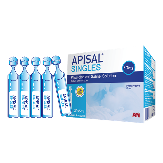 Short Description: • Sodium chloride 0.9% • Single dose sterile format • For eyes, nostrils, contact lens rinsing and enzyme tablet dissolution • Suitable for all ages including newborns and children Long Description: Apisal Singles Sterile Physiological Saline Solution is a solution presented in a single dose format without preservatives or buffering agents, which acts by means of mechanical drag forces and therefore is especially indicated for subjects with sensitive eyes and nostrils. Apisal Single is a sterile and preservative-free isotonic physiological solution that comes in single dose units for both Nasal and Ophthalmic uses. It cleanses and moisturizes nasal passages and helps in removing incrustations, bacteria, viruses, allergens or irritants entrapped in the nasal mucosa. It also helps in cleansing eyes, moisturizing them, and relieving from any irritations. It also loosens and thins out mucous secretions to aid removal from nose and sinuses allowing for easier breathing especially for infants and newborns. It is very safe and non-medicated (Drug-free) so you can use it as often as needed from the first day of birth. Benefits: • Ideal for infants and newborns as it helps cleanse their tiny noses and relieves them from blocked noses allowing for smoother breathing • Cleanses and moisturizes eyes and relieves from irritation • Can be used standalone or in combination with inhalation medications through nebulizers • Suitable for rinsing and cleansing ears • Rinses all type of contact lenses and prevents the dehydration of hydophilic contact lenses • Suitable for dissolution of enzyme tablets • Reduces discomfort resulting from adverse environmental conditions such as settings with air conditioning/heating, dry environments, smoky environments etc How To Use: • Separate an ampoule of the product and open it with freshly washed hands, twisting the top part and ensuring that the ampoule does not come into contact with any surface • Please read the instructions for use given in the package insert on use with contact lenses, ocular and nasal instillation • Do not store at temperature above 25 degree C