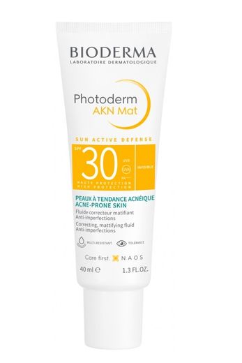 A sunscreen for oily or acne-prone skin that provides high sun protection while also mattifying the skin and helping to prevent blemishes Bioderma Photoderm AKN Mat SPF 30 Fluid 40 ml 173467: Bioderma Photoderm AKN Mat is a sunscreen designed for oily or acne-prone skin that provides high UVA/UVB protection while also mattifying the skin and improving sebum quality. The sunscreen contains active ingredients such as salicylic and glycolic acids, which help to smooth skin texture and prevent a rebound effect. Bioderma Photoderm AKN Mat also contains vitamin E and ginkgo biloba leaf extract which have antioxidant properties to protect the skin from free radical damage caused by the sun. The sunscreen has an invisible fluid texture that is non-sticky and non-greasy and ideal for use in hot and humid climates since it is water, heat, and high humidity resistant.