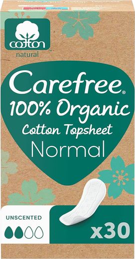 Carefree Organic Cotton Liners provide natural, fresh, and gentle care for sensitive skin. These panty liners are crafted with a 100% certified organic cotton topsheet and offer a gentle and eco-friendly experience. 100% air breathable, they allow for optimal airflow, keeping you feeling fresh and comfortable all day long. Carefree Organic Cotton Liners are specially designed with 0% fragrance, dyes, and elemental chlorine bleaching, making them ideal for individuals with sensitive skin and ensuring long-lasting comfort. Their dermatologically tested and hypoallergenic cover allows for a natural, fresh feeling on even the most sensitive skin types. As part of our commitment to sustainability, our packs are produced in a CO2 neutral plant and the carton packaging is 100% recyclable and made from 80% recycled materials. INGREDIENTS: 100% Organic Cotton STORAGE INSTRUCTIONS: Store in a cool and dry place, away from the sunlight
