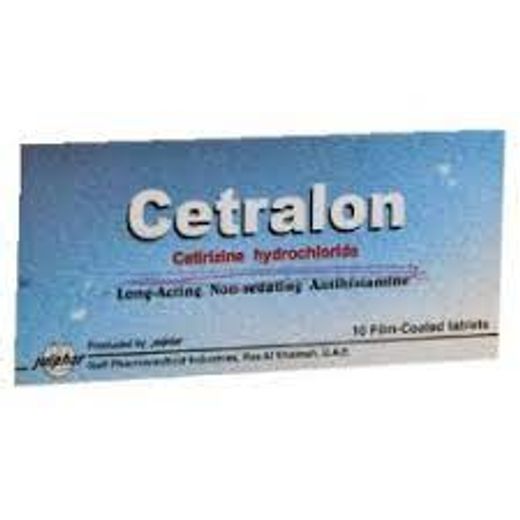 Cetralon for treat allergic symptoms include itching and cold. Cetralon - 10 Tablets cetirizine Cetirizine is a second generation antihistamine that reduces the natural chemical histamine in the body. Histamine can produce symptoms of sneezing, itching, watery eyes, and runny nose. Cetirizine is used to treat cold or allergy symptoms such as sneezing, itching, watery eyes, or runny nose. Cetirizine is also used to treat an allergic reaction, itching and swelling caused by chronic urticaria (hives) and minimizes or eliminates the symptoms of perennial allergic rhinitis, seasonal allergic rhinitis, chronic idiopathic urticaria, allergic asthma, physical urticaria, and atopic dermatitis. Indications: • Treatment of rhinitis • Allergic • Urticaria • Chronic idiopathic How store: keep at room temperature.