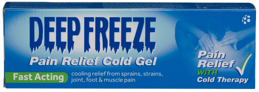A topical cold gel that is used as an alternative to ice, preventing swelling during bruising or relieving pain from muscle strains and spasms. Deep Freeze Pain Relief Cold Gel 100 g Deep Freeze Gel is a cold gel used to relieve pain and speed up the healing of bruises, muscle spasms, strains, and swelling. The gel works through cold therapy, instantly cooling the area and decreasing sensations in the nerves, leading to pain relief. Cold therapy also reduces blood flow to the area, minimizing damage from the injury and preventing its aggravation and swelling. Deep Freeze gel provides immediate pain relief and helps treat strains, muscle spasms, joint pain, and swollen bruises.