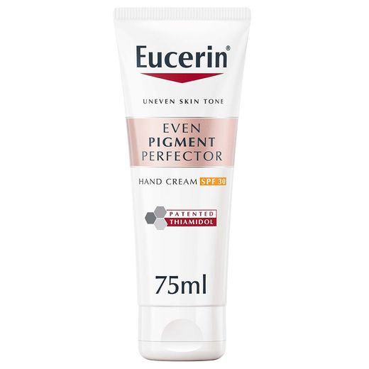 Short Description: • For uneven skin tone • Dermatological skin care • SPF 30 • First results in 2 weeks • With patented thiamidol Long Description: Eucerin Even Pigment Perfector Hand Cream contains Thiamidol, an effective and Eucerin patented ingredient that acts at the root cause of hyperpigmentation by reducing melanin production. It is clinically and dermatologically proven to reduce dark spots and prevent their re-appearance with regular use. Ten years in development, this highly effective active is clinically and dermatologically proven to reduce dark spots and prevent their re-appearance. The cream also contains Hyaluronic acid, which has the property to retains moisture and binds up to 10,000 times its own weight in water. First results are visible in two weeks and improve continuously with regular use. The product has SPF 30 that offers effective protection from the sun and reduces the chances of skin developing sun-induced age spots. Pigment spots on the hands are visibly reduced and skin appears even and radiant with regular use. Benefits: • Visibly reduces the appearance of pigment spots and prevents their reappearance • Provides well-moisturised skin for 24 hours • Active ingredient Thiamidol helps to prevent spots from reappearing • Makes your hand appear yonger How To Use: • You can apply Eucerin Hand Cream daily to your hands up to four times a day only as it contains the active ingredient Thiamidol • Massage into your hands until the cream is completely absorbed • Avoid contact directly on or near your eyes • Store below 25 degree celsius • For best results, apply overnight