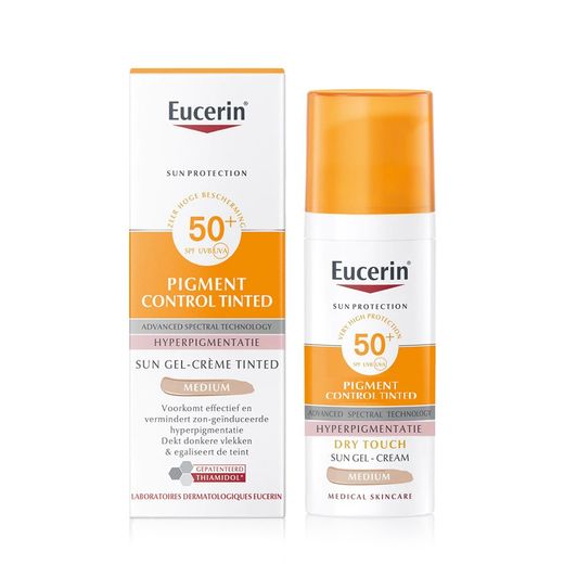 Short Description: • High factor UVA/UVB protection and HEVIS light defense • Innovative pigment control with glycyrrhetinic acid • Extremely thin, non-greasy, non-sticky gel texture Long Description: Eucerin Sun Pigment Control SPF50+ Tinted Medium Gel-Cream provides a high sun protection factor to the skin while reducing and preventing hyperpigmentation. This product tints the skin giving it high coverage and a radiant natural finish. The formula also supports the skin's own DNA repair mechanism thanks to the innovative pigment control that includes glycyrrhetinic acid. Specifically about its depigmenting benefit, this cream has in its composition thiamidol, an effective and patented ingredient. It acts at the root cause of hyperpigmentation while visibly reducing dark spots over time and, when used regularly, prevents their re-appearance. In this sense, the complexion of the face is much more uniform in addition to being strongly protected. Finally, the presence of Glycerin makes this daily cream very moisturizing as it retains moisture in the skin for a long time. On the whole this fluid cream evens out skin tone while reducing and preventing the appearance of dark spots and it protects the skin from the sun's rays while also hydrating it. Benefits: • Prevent the appearance of dark spots and their re-appearance • Strongly protects the skin while it evens out and moisturizes it • Neutralizes free radicals, supports the skin's own DNA repair mechanism • Helps to prevent or reduce sun-Induced skin damage How To Use: • Apply the gel cream generously on face before sun exposure and reapply frequently especially after swimming, perspiring or toweling to maintain the original protection • Avoid contact with eyes and allow product to absorb completely