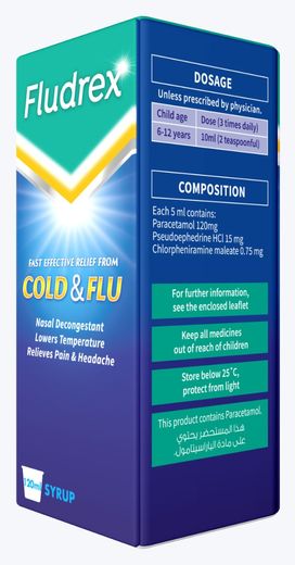 Short Description: • Fast and effective relief from colds and flu • For children from 6-12 years • Each 5 ml contains 120 mg paractamol, pseudoephedrine HCl 15mg and chlorpheniramine maleate 0.75 mg Long Description: Fludrex Syrup contains active ingredients in appropriate dose, that can effectively reduces cold symptoms. Paractamol ease aches, pains and lower body temperature pseudoephedrine relieves nasal congestion caused by colds, allergies, and hay fever and chlorpheniramine maleate relieves symptoms of allergy, hay fever, and the common cold. Benefits: • Relieves nasal congestion and rhinorrhoea • Lowers temperature due to common cold • Relieves pain and headache How To Use: • Children 6-12 years: 10 ml (2 teaspoon ful) 3 times a day