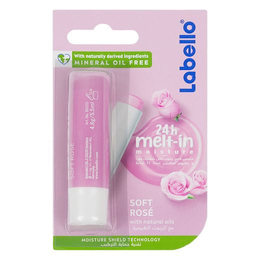 Short Description: • Caring lip balm • Cares and supports natural rosiness • With rose extract Long Description: Labello Soft Rose underlines the natural rosiness of your lips and gives it a subtle rose shine. The innovative formula with Hydra IQ contains rose extract. Benefits: • Underlines the natural rosiness of your lips • Provides your lips with a velvety soft lip feeling • Protects and cares for your lips with intensive moisturisation How To Use: Apply daily to your lips.