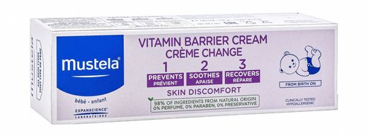 Short Description: • Vitamin barrier cream • Prevents, soothes and recovers • Clinically tested • High tolerance from birth on • Hypoallergenic Long Description: Mustela Vitamin Barrier Cream has been specially formulated to tackle the factors that trigger irritations and redness in the nappy area. The unique combination of patented natural active ingredients guarantees three-fold effectiveness. Very high tolerance formula (100% well tolerated) right from birth with 98per_centage ingredients of natural origin and without fragrance and preservatives. Benefits: • Prevents irritations and redness at each change • Soothes and relieves from the 1st application • Recover and repairs continually • Very easy to apply and wipe off and can be completely rinsed off • Pleasant fragrance How To Use: Apply a thick layer onto your baby's clean and dry diaper area every time you change