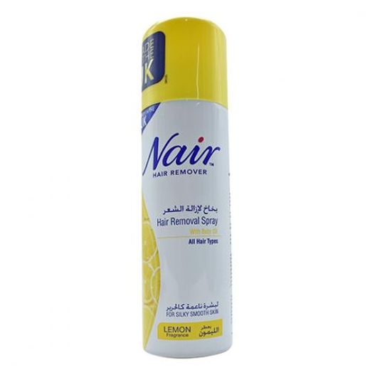 Short Description: • Hair body removal spray • With natural extracts • Dermatologically tested • For legs and underarms • Lemon fragrance with baby oil Long Description: Nair Body Removal Spray with lemon fragrance is enriched with natural extracts to help leave your skin smooth and moisturized. This is ready to use body spray that are quick and easy way to remove even short hairs, with clinically proven efficacy. It is infused with Lemon extracts that help fight bacteria and irritation while keeping your skin smooth and silky. Benefits: • For silky smooth skin • Lasts days longer than shaving • Effectively removes even short hair • Helps in removing hair from difficult or large areas How To Use: • Shake upright can. Spray 5 cm from skin and cover unwanted hair thickly, do not rub. • After 3-5 minutes, test a small area. If the hair does not come away from the test area easily, leave on for a few minutes. Do not leave for more than 12 minutes in total. • Shower off with lukewarm water using a wet cloth if required and pat skin dry with a soft towel. • Rinse nozzle after use and replace cap.