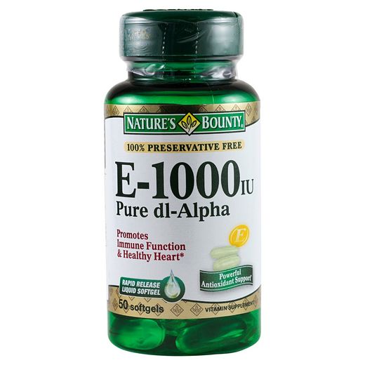 Short Description: • Supports Immune & Antioxidant Health • Pure dl-Alpha • 100% Preservative Free Long Description: Nature's Bounty E-1000IU Pure dl-Alpha Softgels contains essential nutrient that supports immune function Vitamin E contains antioxidant properties that help fight free radicals in the body, these free radicals may contribute to the premature aging of cells. Benefits: • Convenient to consume softgel • Boosts body immunity • Help fight free radicals in the body How To Use: • For adults, take one (1) softgel daily, preferably with a meal.