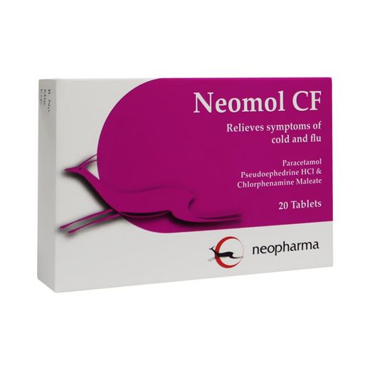 Short Description: • Relieves symptoms of cold and flu • Contains Paracetamol, Pseudoephedrine HCl and Chlorphenamine maleate • Analgesic, decongestant and anti-allergic Long Description: Neomol CF Tablets is used to treat symptoms occurring with common cold such as nasal congestion, sinus congestion, sinus pain, headache, sneezing, itchy and watery eyes. Benefits: • Reduces fever and body pain • Provides relief from nasal congestion and itching • Helps reduce swelling and thus allowing the respiratory passages to open How To Use: Adults and children over 12 years of age: Take 2 tablets up to four times a day or as recommended by the doctor.