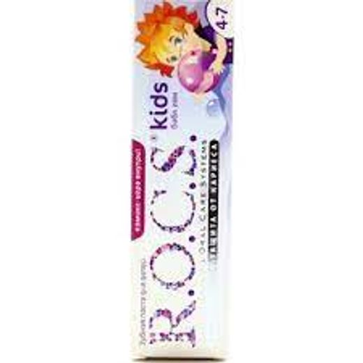 Short Description: • Remineralizing oral care system • Confirmed by laboratory tests and clinical studies • May be recommended for allergy-prone children • Does not contain sodium lauryl sulfate • With Amifluor complex • Effective protection against caries Long Description: R.O.C.S. Kids 4-7 Bubble Gum Toothpaste was developed with the participation of dentists, taking into account the age characteristics of the child. Chewing gums with their bright tastes always attract children! The low abrasion formula does not injure tooth tissue (RDA = 45). A small amount of pea-sized paste is recommended for brushing your teeth. Active ingredient: Olaflur (F-500 ppm), having anti-inflammatory and anti-cariotic properties, begins to act from the 20th second after application. Benefits: • Strengthens the enamel of both primary and permanent teeth • Provides fast (within 20 seconds) formation of a highly protective layer on the tooth surface • Prevents demineralization and promotes intensive teeth saturation of minerals • Xylitol normalizes oral microflora balance How To Use: • Preschool children should brush their teeth under the supervision of adults. The 2-year clinical observations confirmed the high effectiveness of ROCS Kids toothpaste.