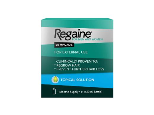 Short Description: • Contains 2% minoxidil • Topical solution for external use • One month's supply (1 x 60 ml bottle) • For men and women Long Description: Regaine 2% Topical Solution contains minoxidil which works by increasing the supply of blood and nutrients to hair follicles, helping to strengthen and revitalise the hair follicles to help hair regrowth. It penetrates the root to help stop hair thinning, reactivate inactive follicles, whilst strengthening and revitalising the hair follicle to grow new, thicker hair. Benefits: • Helps to promote hair growth • Enough for 1 month of treatment • Stimulates follicle movement from resting to hair growth phase How To Use: • Part the hair and expose the scalp, making sure its dry. If a comb is used, ensure that it has rounded widely-spaced teeth • Apply 1 ml Regaine twice daily to the scalp, beginning at the center of the affected area. • Regaine comes with 2 applicators for application: Pump spray applicator for large areas of the scalp and Extended spray-tip applicator for small areas of the scalp • Massage the solution gently into the scalp after application. Wash your hands after use.