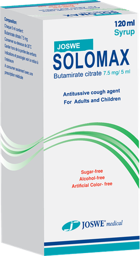 Solomax 1.5 mg/mL Syrup 120 mL contains Butamirate which is a non-narcotic antitussive that presents nonspecific anticholinergic and antispasmodic effects, facilitating respiration. It acts centrally by diminishing the tussigenic reflex, and peripherally via a broncho spasmolytic activity enhanced by anti-inflammatory action. Butamirate (or brospamin) is a cough suppressant medicine used for the symptomatic treatment of non-productive (dry) cough. - Used for the treatment of dry cough - Anti-inflammatory effect - Broncho spasmolytic activity - Decreases airway resistance.