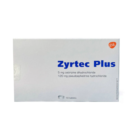These are tablets containing the antihistamine cetirizine and the decongestant pseudoephedrine, that are used to treat allergies and nasal congestion.Zyrtec Plus 5/120 mg 14 Tabs Zyrtec tablets contain two active ingredients used to alleviate symptoms associated with respiratory conditions such as nasal allergies or congestion. The tablets contain cetirizine, which is an antihistamine that relieves allergy symptoms such as sneezing or itching. The tablets also contain pseudoephedrine, which is a substance that effectively relieves nasal congestion and sinus congestion. Zyrtec Plus tablets are used to treat symptoms such as stuffy nose, sneezing, runny nose, itchy nose, or itchy eyes.